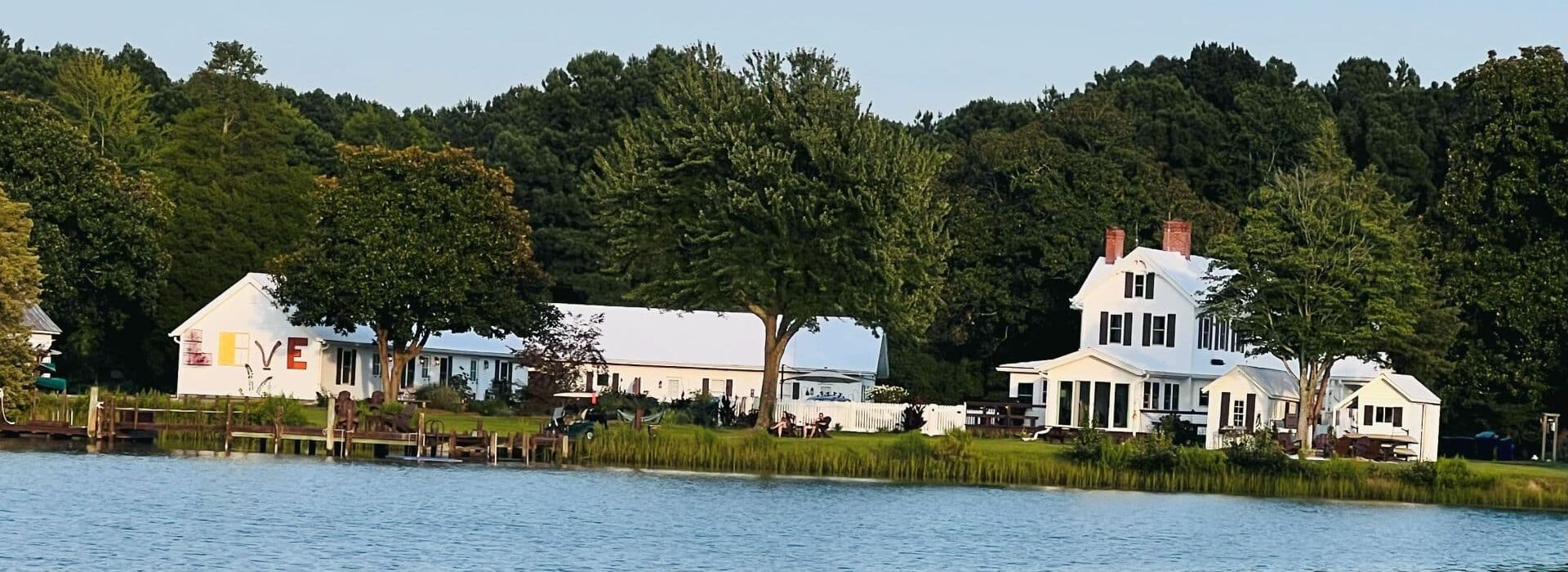 Man with a tripod standing on a pier looking out at calm water at dusk